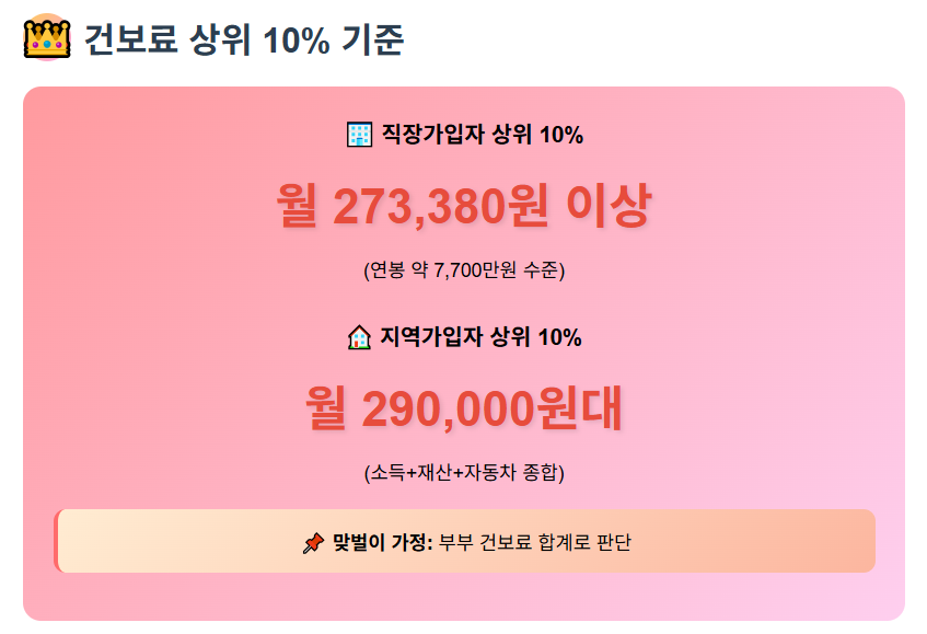 - 월 건강보험료 20만9970원 이상이면 소득이 높다고 판단되어 상위 10%로 분류됩니다.