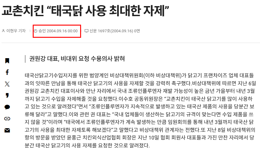 교촌치킨의 태국산 논란은 사실 2004년부터 시작된 오래된 이슈입니다. 당시 태국산닭고기수입저지를 위한 범양계인 비상대책위원회에서 교촌치킨 대표이사와 만나 "교촌치킨이 태국산 닭고기를 많이 사용하고 있는 것으로 알려졌다"며 조류인플루엔자 우려로 사용 자제를 요청했습니다.