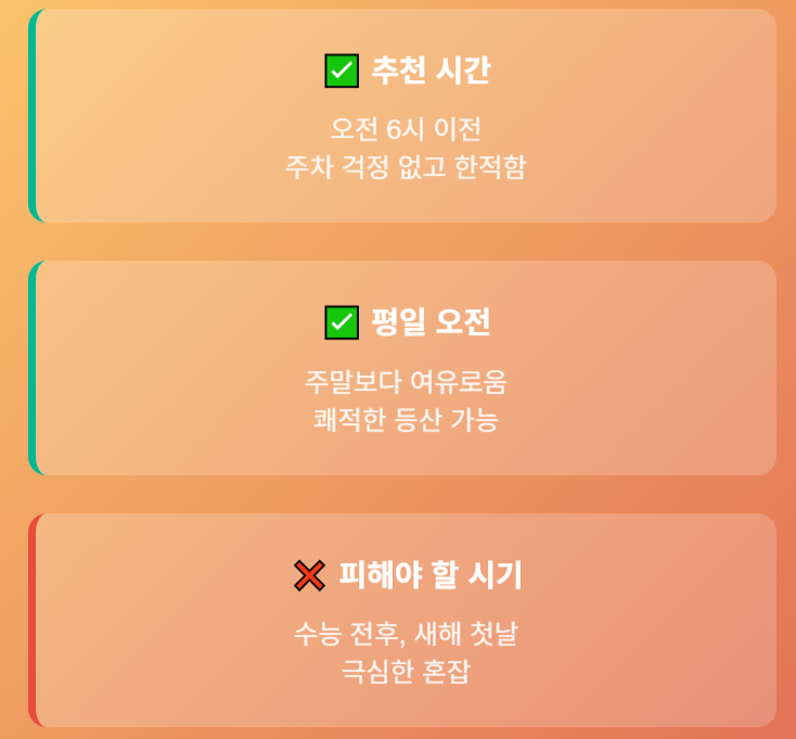 - 피해야 할 시기: 수능 전후, 새해 첫날 (극심한 혼잡)