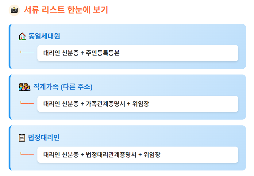 └── 대리인 신분증 + 가족관계증명서 + 위임장