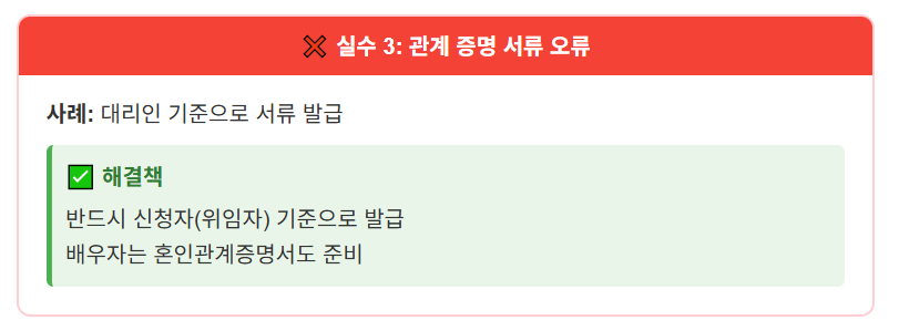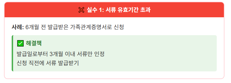 실수 사례: 6개월 전에 발급받은 가족관계증명서로 신청 해결책: 발급일로부터 3개월 이내 서류만 인정 예방법: 신청 직전에 서류 발급받기