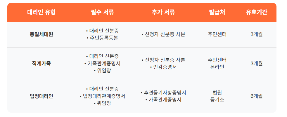 └── 대리인 신분증 + 법정대리관계증명서 + 위임장