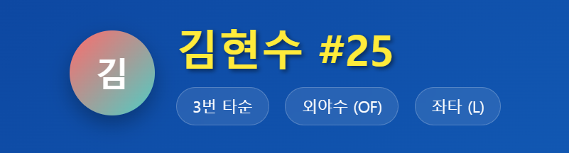 예를 들어 "김현수 #25 3번 OF 좌타"라고 나오면, 김현수 선수가 25번을 달고 3번 타순으로 나온 외야수이며 좌타자라는 뜻입니다.