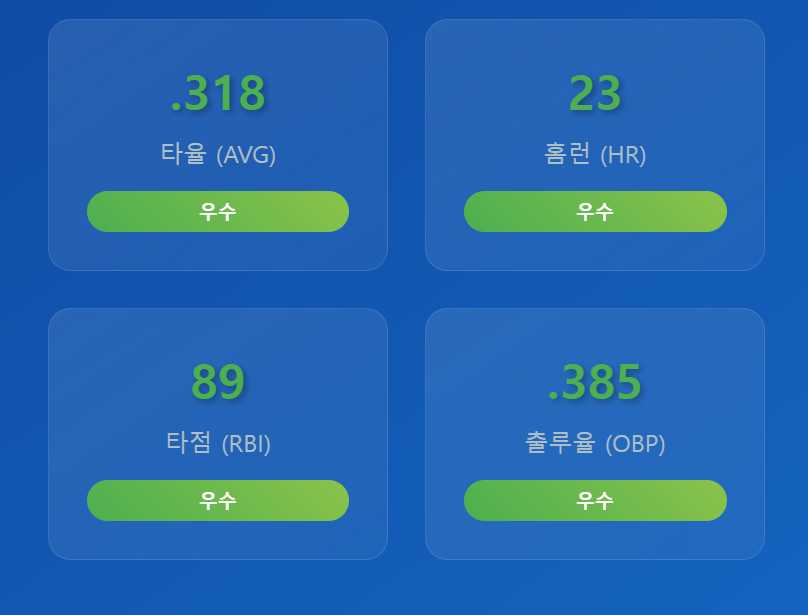 홈런 23개: 시즌 홈런 20개 이상이면 장타자로 분류됩니다. 클린업(3-5번) 타자에게 기대되는 수치입니다.
