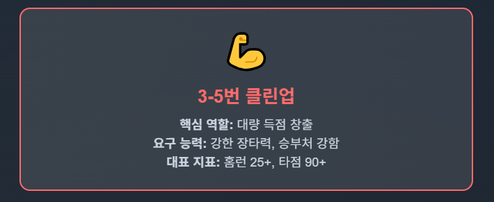| 3-5번 | 클린업 | 홈런 20+, 타점 80+ | 대량 득점 창출 |