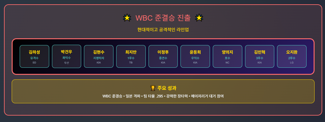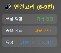 | 6-9번 | 보조 | 타율 .260+, 상황타격 | 기회 연결과 서포트 |