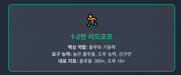 | 1-2번 | 리드오프 | 출루율 .350+, 도루 15+ | 출루와 기동력 |