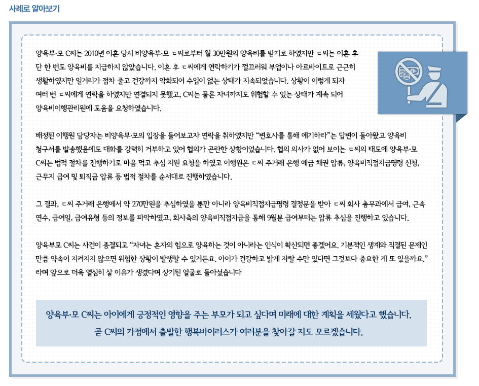 C씨는 양육비이행관리원 도움으로 비양육부모의 주거래 은행에서 270만원을 추심하고, 직접지급명령을 통해 매월 급여에서 양육비를 자동으로 받게 되었습니다.