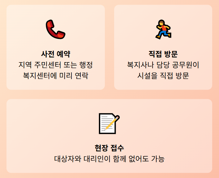 - 복지사나 담당 공무원이 직접 시설을 방문해 신청서 접수