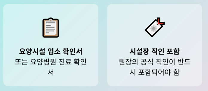 - 요양시설 입소 확인서 또는 요양병원 진료 확인서