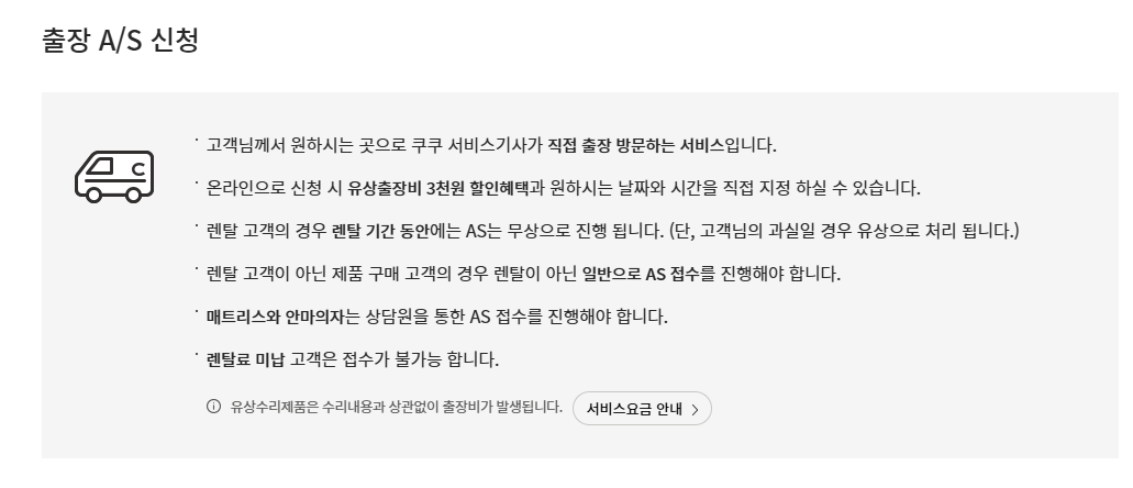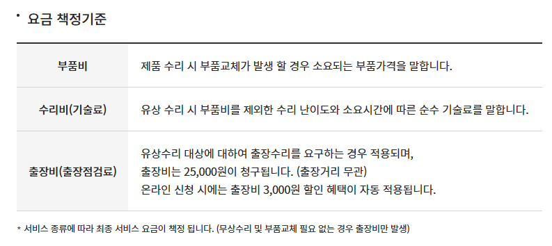 • 유상수리 제품은 수리 내용과 관계없이 출장비가 발생합니다