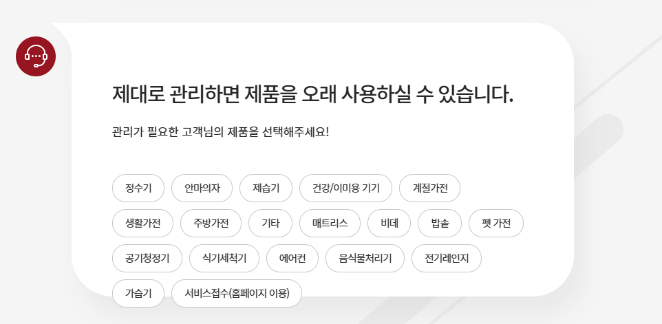 렌탈 고객의 경우 렌탈 기간 동안 AS는 무상으로 제공됩니다. 단, 고객 과실로 인한 고장은 유상 처리되며, 정수기나 비데 등 렌탈 제품군은 채팅 상담이나 고객상담실을 통해서만 접수 가능합니다.