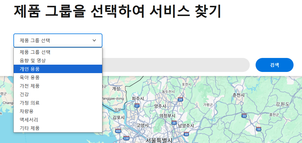 - 서비스센터 위치 찾기: 주소·제품그룹 입력 후 전국 50여 개 센터 위치·연락처·운영시간 확인