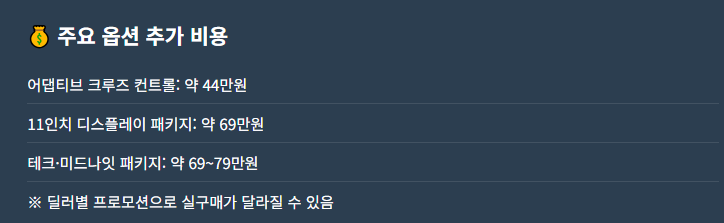 👉 실 구매 전에는 옵션 포함 여부를 꼼꼼히 확인하고, 딜러 견적을 비교하는 것이 좋습니다.