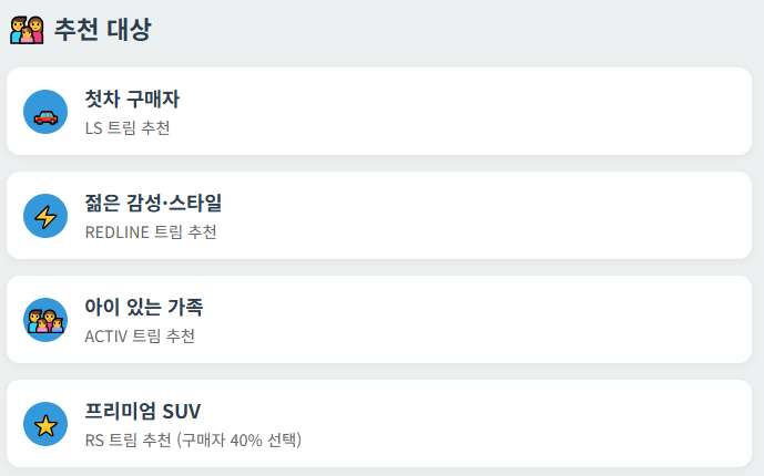 트림별 특징을 잘 비교해보시고, 자신에게 꼭 맞는 트림을 선택해보세요!
