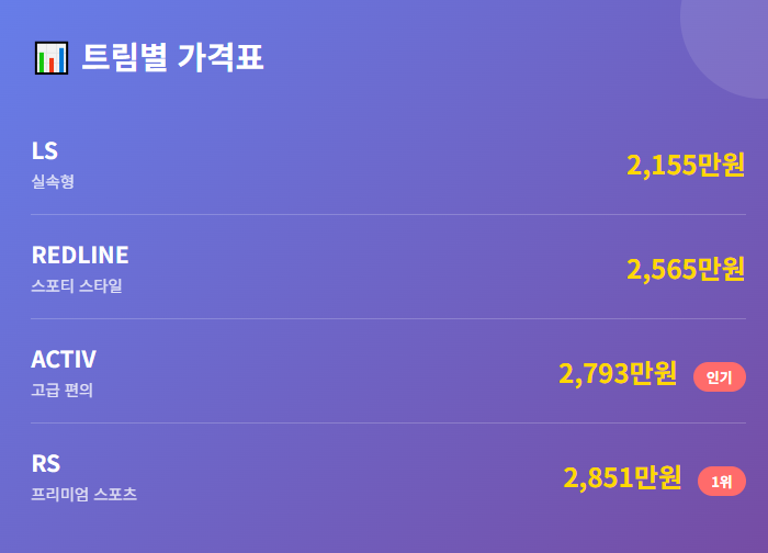 과연 이번 모델에서 가장 인기 있는 트림은 무엇일지, 트림별 가격과 특징을 한눈에 정리해드립니다.